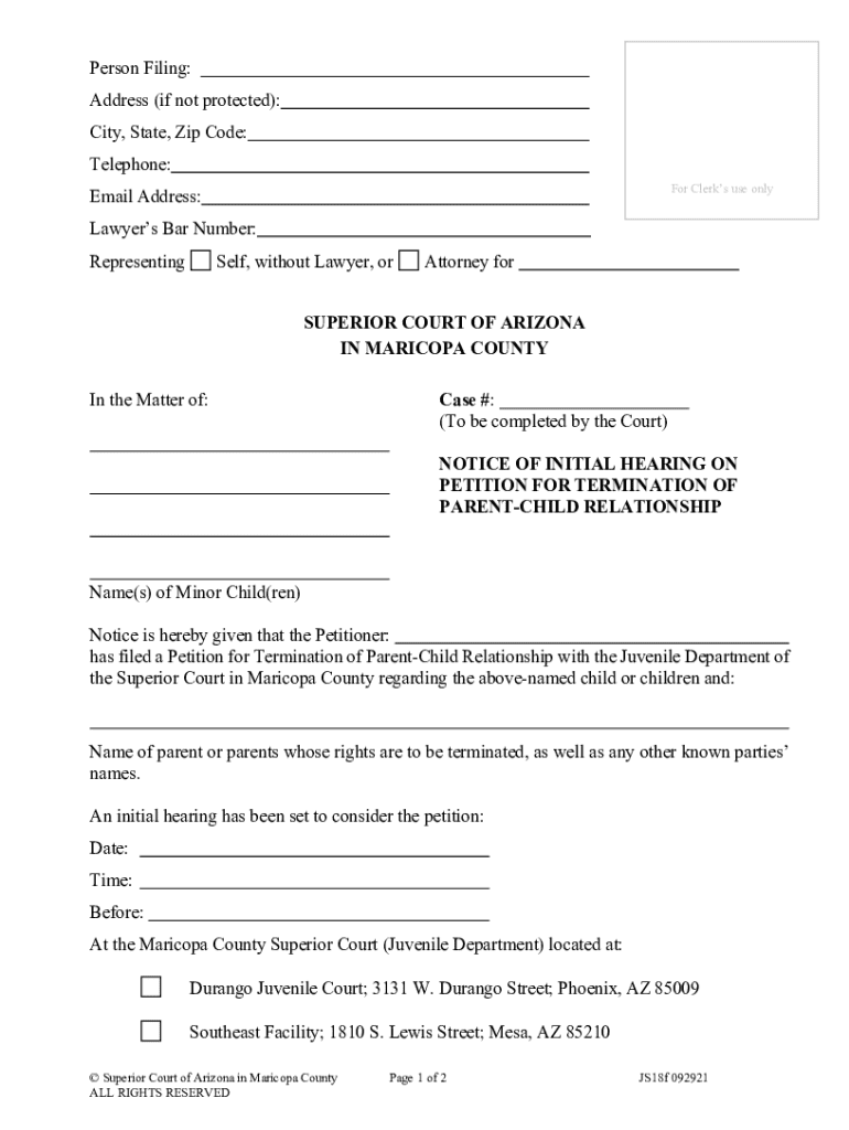 Get the free NOTICE OF INITIAL HEARIN ON PETITION FOR TERMINATION OF ... - superiorcourt maricopa