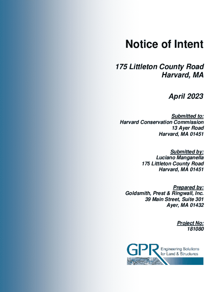 Notice of Intent 175 Littleton County Road Harvard, MA April 2023 Submitted to: Harvard Conservation Commission 13 Ayer Road Harvard, MA 01451Submitted by: Luciano Manganella 175 Littleton County