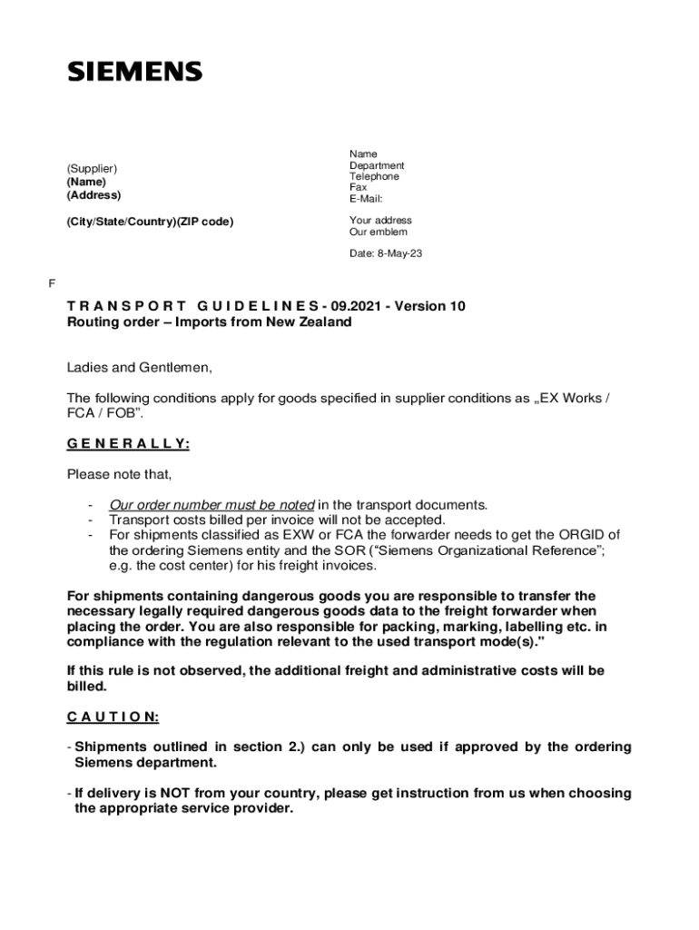 (Supplier) (Name) (Address) (City/State/Country)(ZIP code)Name Department Telephone Fax Email: Your address Our emblem Date: 8May23F r e i v e r w e n d b an r. T R A N S P O R T G U I D E L I N E