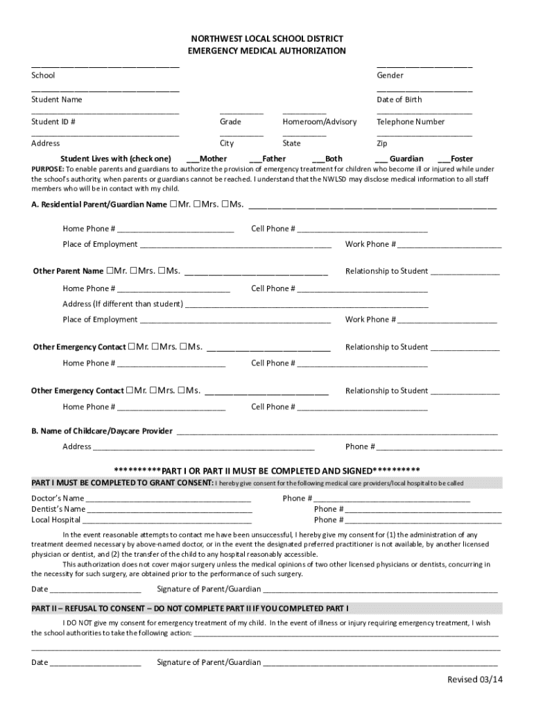 NORTHWEST LOCAL SCHOOL DISTRICT EMERGENCY MEDICAL AUTHORIZATION ______SchoolGender______Student Name ___ Student ID # ___ Address Student Lives with (check one)___ Grade ___ City ___Mother___ Homeroom/Advisory