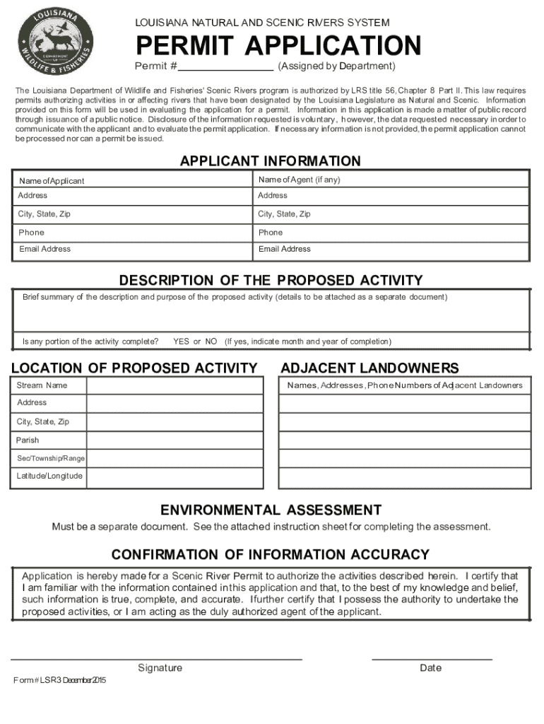 LOUISIANA NATURAL AND SCENIC RIVERS SYSTEMPERMIT APPLICATIONPermit #(Assigned by Department)The Louisiana Department of Wildlife and Fisheries\' Scenic Rivers program is authorized by LRS title 56,