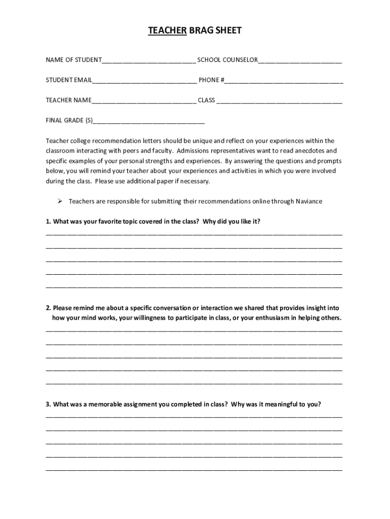 TEACHER BRAG SHEET NAME OF STUDENT___ SCHOOL COUNSELOR___ STUDENT EMAIL___ PHONE #___ TEACHER NAME___ CLASS ___ FINAL GRADE (S)___ Teacher college recommendation letters should be unique and reflect