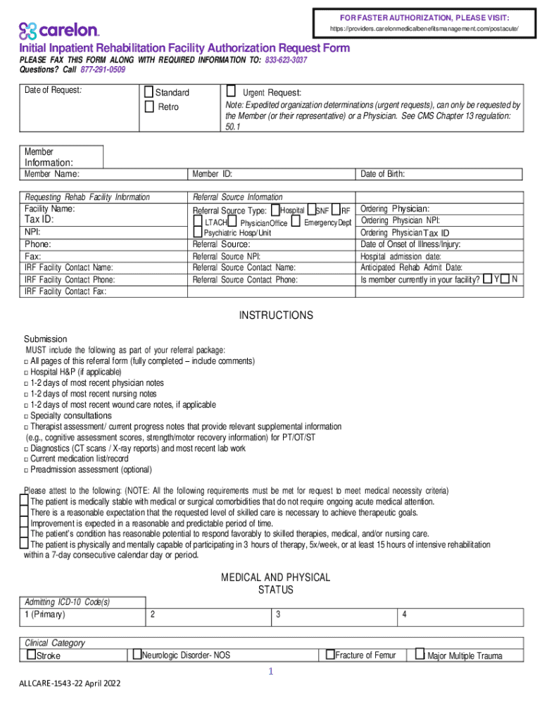 FOR FASTER AUTHORIZATION, PLEASE VISIT: https://providers.carelonmedicalbenefitsmanagement.com/postacute/Initial Inpatient Rehabilitation Facility Authorization Request Form PLEASE FAX THIS FORM ALONG