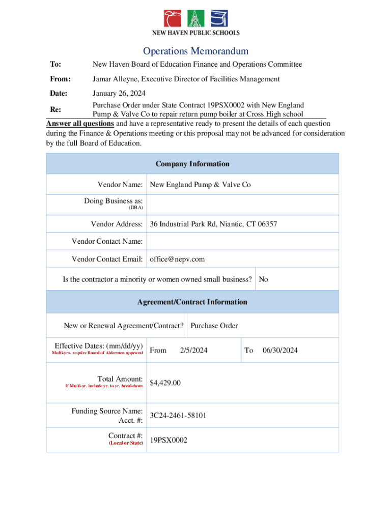 Operations Memorandum To:New Haven Board of Education Finance and Operations CommitteeFrom:Jamar Allan, Executive Director of Facilities ManagementDate:January 26, 2024Purchase Order under State Contract