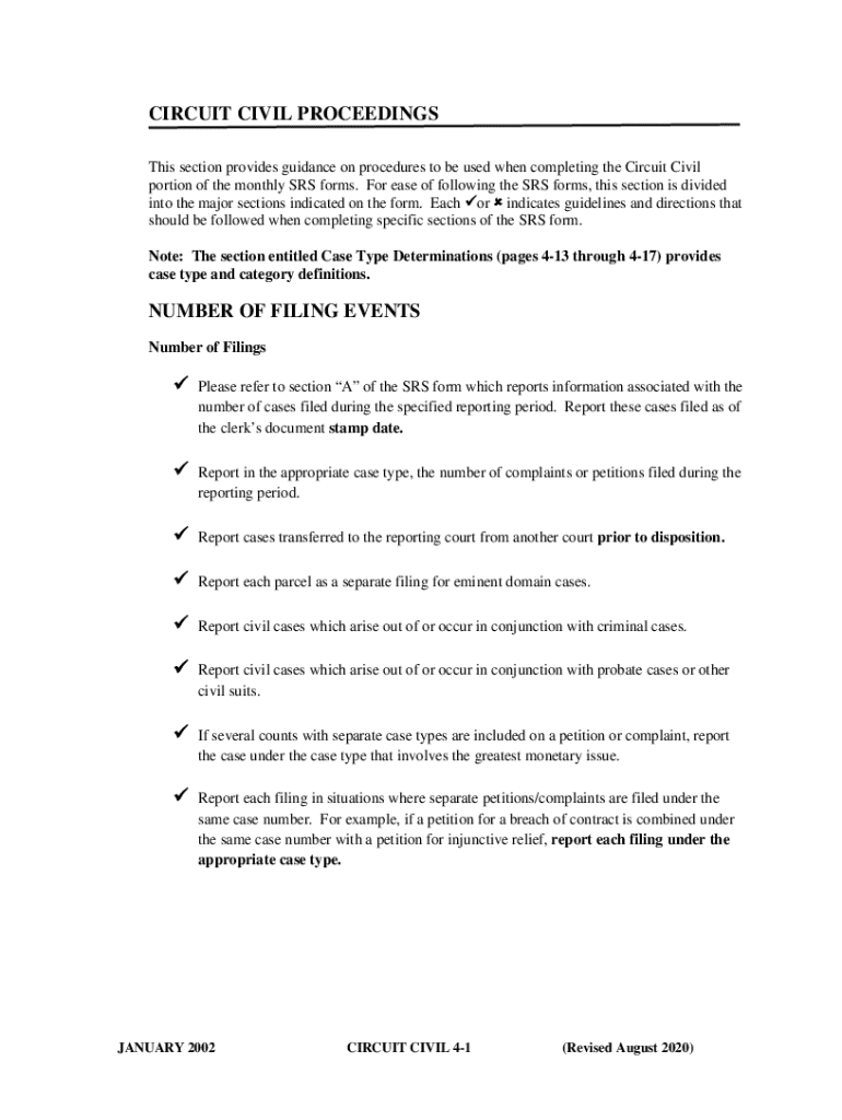 CIRCUIT CIVIL PROCEEDINGS This section provides guidance on procedures to be used when completing the Circuit Civil portion of the monthly SRS forms. For ease of following the SRS forms, this section