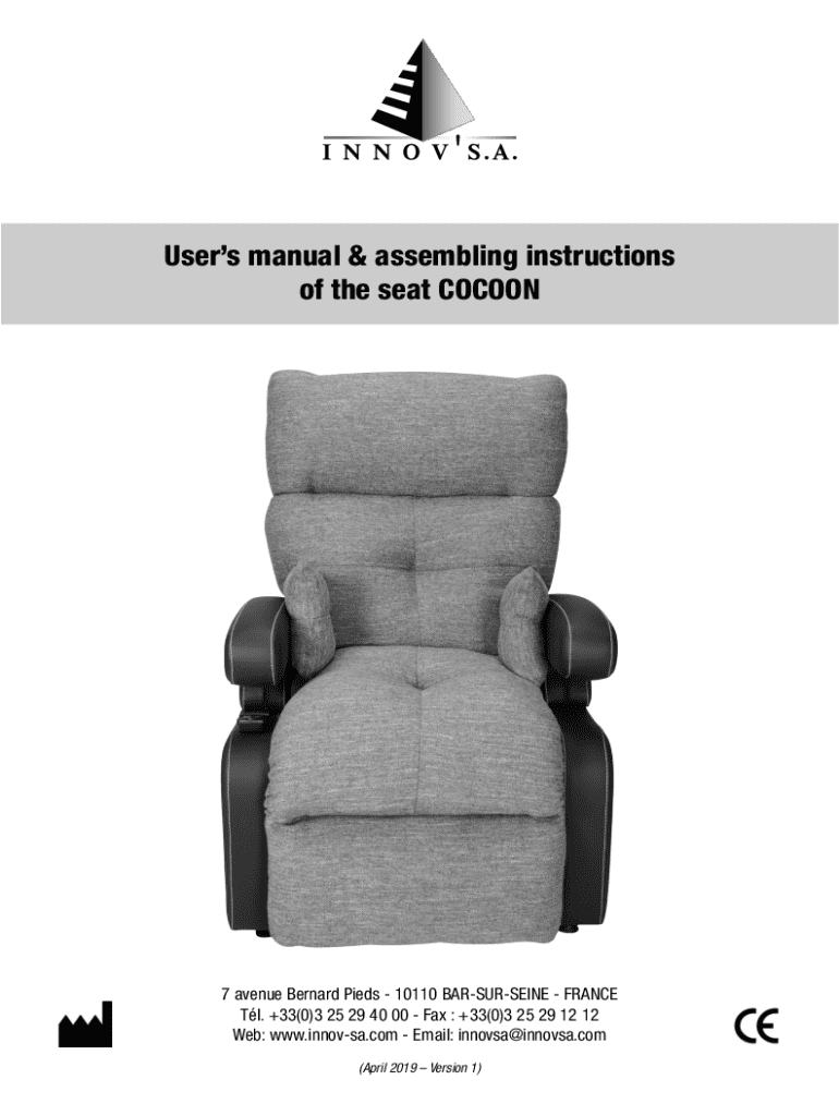 Users manual & assembling instructions of the seat COCOON7 avenue Bernard Pieds 10110 BARSURSEINE FRANCE Tl. +33(0)3 25 29 40 00 Fax : +33(0)3 25 29 12 12 Web: www.innovsa.com Email: innovsa@innovsa.com