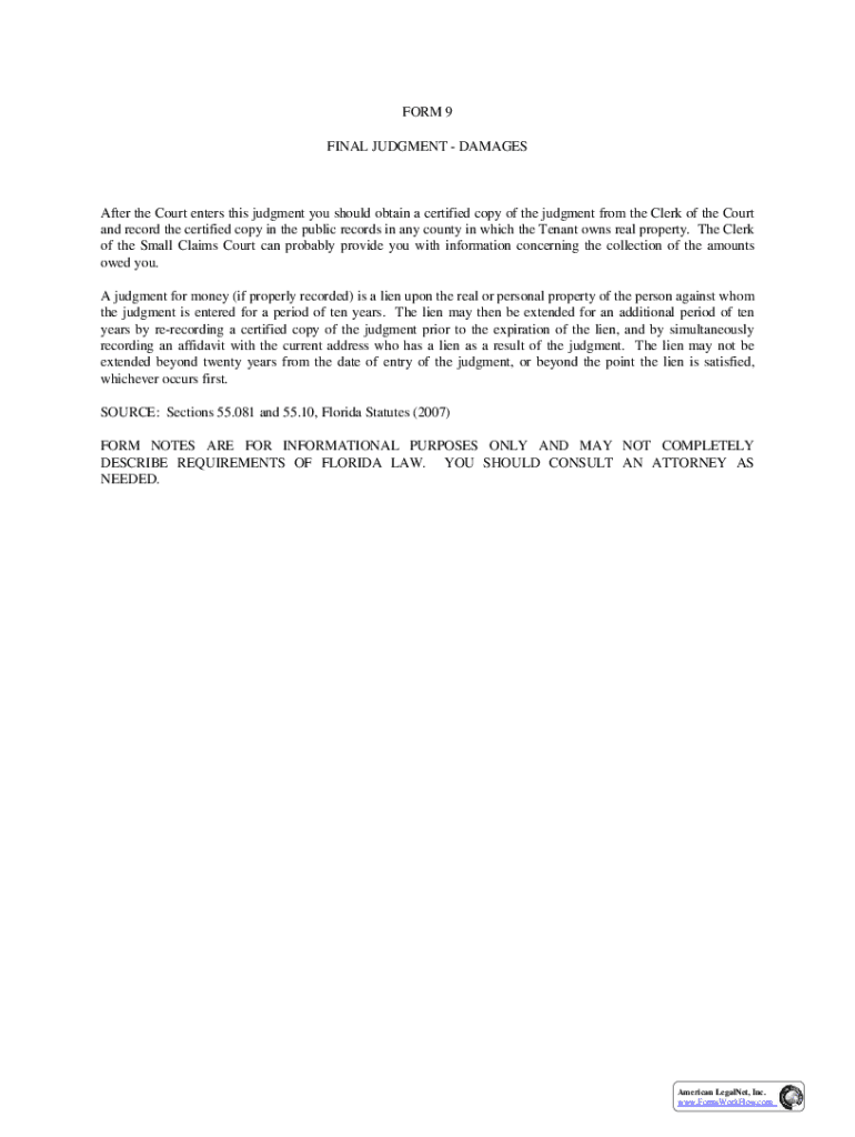 FORM 9 FINAL JUDGMENT DAMAGESAfter the Court enters this judgment you should obtain a certified copy of the judgment from the Clerk of the Court and record the certified copy in the public records