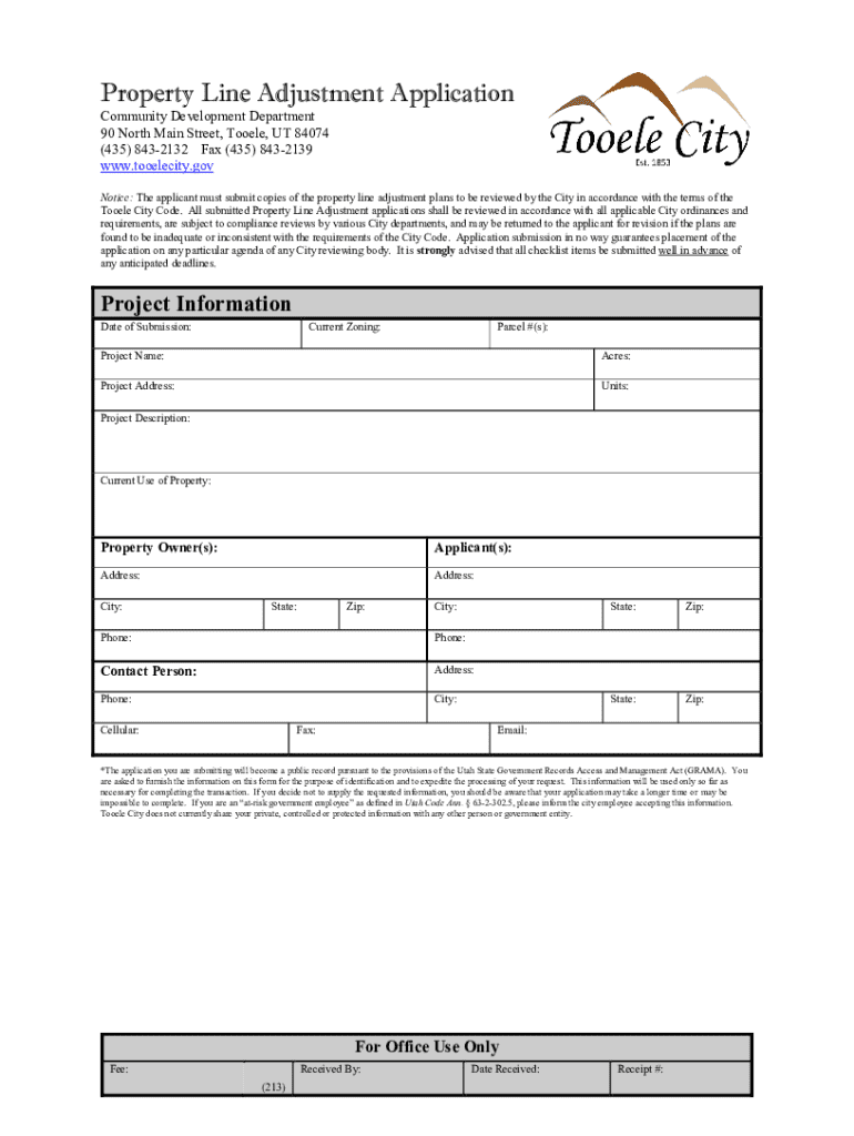Property Line Adjustment Application Community Development Department 90 North Main Street, Toole, UT 84074 (435) 8432132 Fax (435) 8432139 www.tooelecity.govNotice: The applicant must submit copies