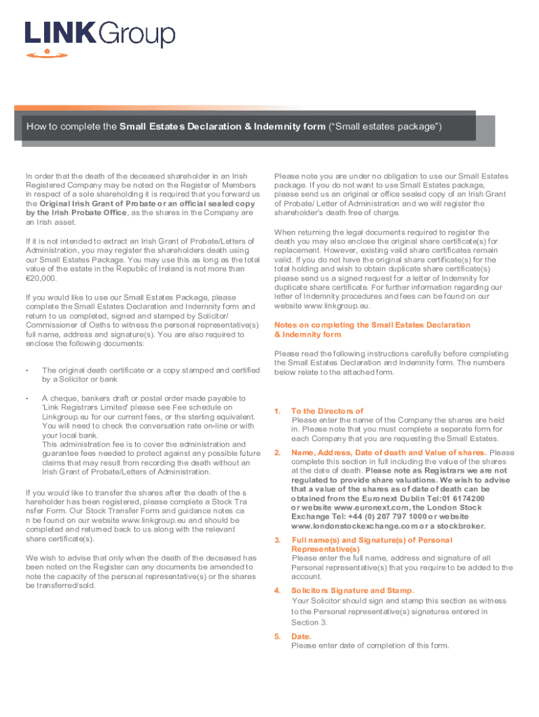 How to complete the Small Estates Declaration & Indemnity form (Small estates package)In order that the death of the deceased shareholder in an Irish Registered Company may be noted on the Register