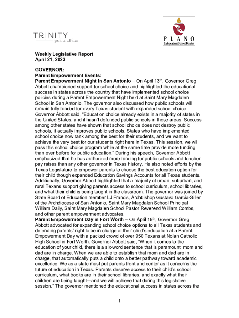 Weekly Legislative Report April 21, 2023, GOVERNOR: Parent Empowerment Events: Parent Empowerment Night in San Antonio On April 13th, Governor Greg Abbott championed support for school choice and
