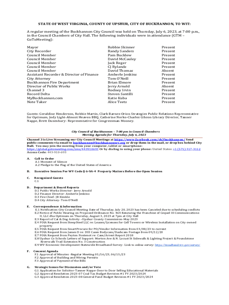 STATE OF WEST VIRGINIA, COUNTY OF USHER, CITY OF BUCHANAN, TO WIT: A regular meeting of the Buchanan City Council was held on Thursday, July 6, 2023, at 7:00 p.m., in the Council Chambers of City