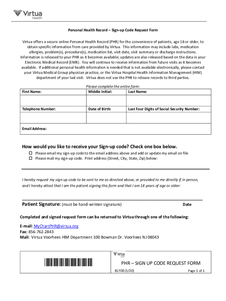Personal Health Record Sign up Code Request Form Virtual offers a secure online Personal Health Record (PHR) for the convenience of patients, age 18 or older, to obtain specific information from care