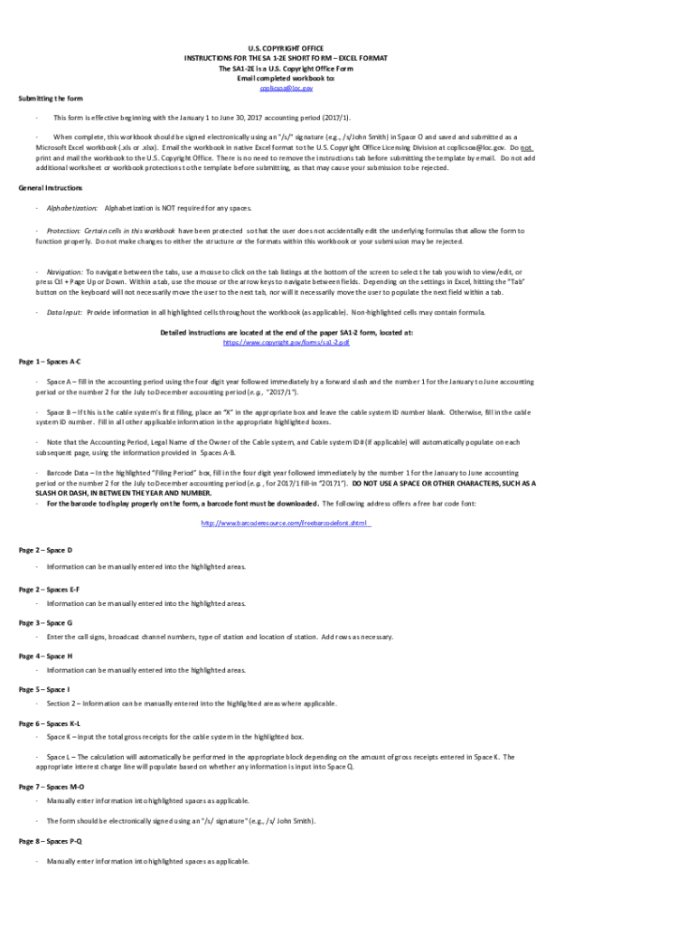 U.S. COPYRIGHT OFFICE INSTRUCTIONS FOR THE SA 12E SHORT FORM EXCEL FORMAT The SA12E is a U.S. Copyright Office Form Email completed workbook to: coplicsoa@loc.govSubmitting the form This form is effective