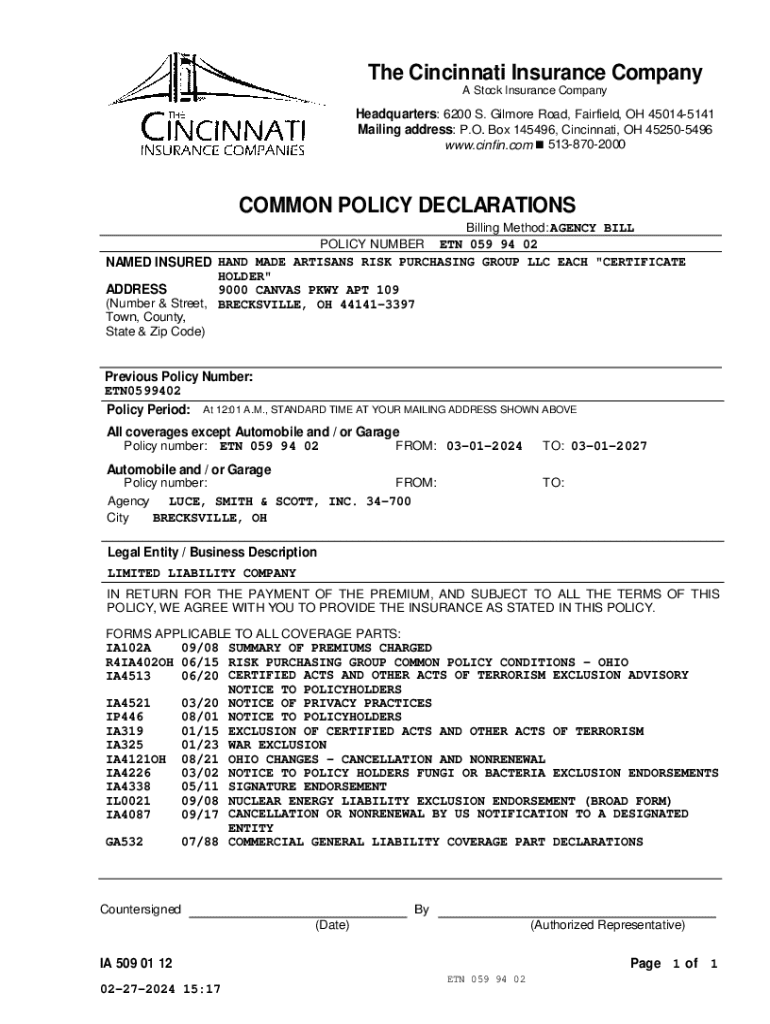 The Cincinnati Insurance Company A Stock Insurance CompanyHeadquarters: 6200 S. Gilmore Road, Fairfield, OH 450145141 Mailing address: P.O. Box 145496, Cincinnati, OH 452505496 www.cinfin.com n 5138702000COMMON