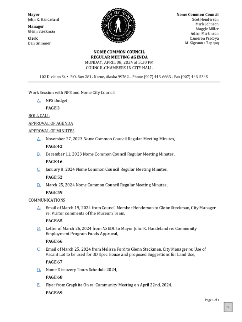 Nome Common Council Scot Henderson Mark Johnson Maggie Miller Adam Martin son Cameron Pistol M. Savanna TapqaqMayor John K. Hand eland Manager Glenn Stockman Clerk Dan GrimmerNOME COMMON COUNCIL REGULAR