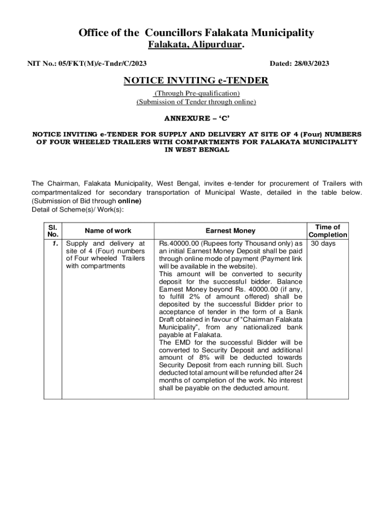 Office of the Councillors Falakata Municipality Falakata, Alipurduar. NIT No.: 05/FKT(M)/eTndr/C/2023Dated: 28/03/2023NOTICE INVITING eTENDER (Through Prequalification) (Submission of Tender through