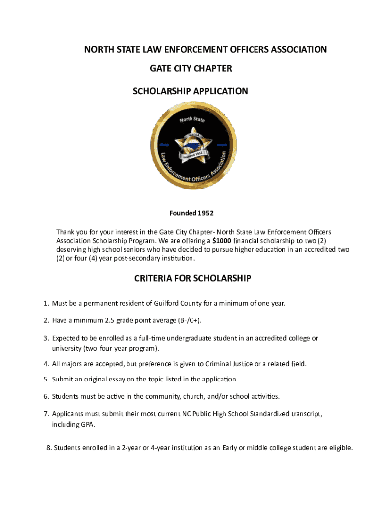 NORTH STATE LAW ENFORCEMENT OFFICERS ASSOCIATION GATE CITY CHAPTER SCHOLARSHIP APPLICATIONFounded 1952 Thank you for your interest in the Gate City Chapter North State Law Enforcement Officers Association