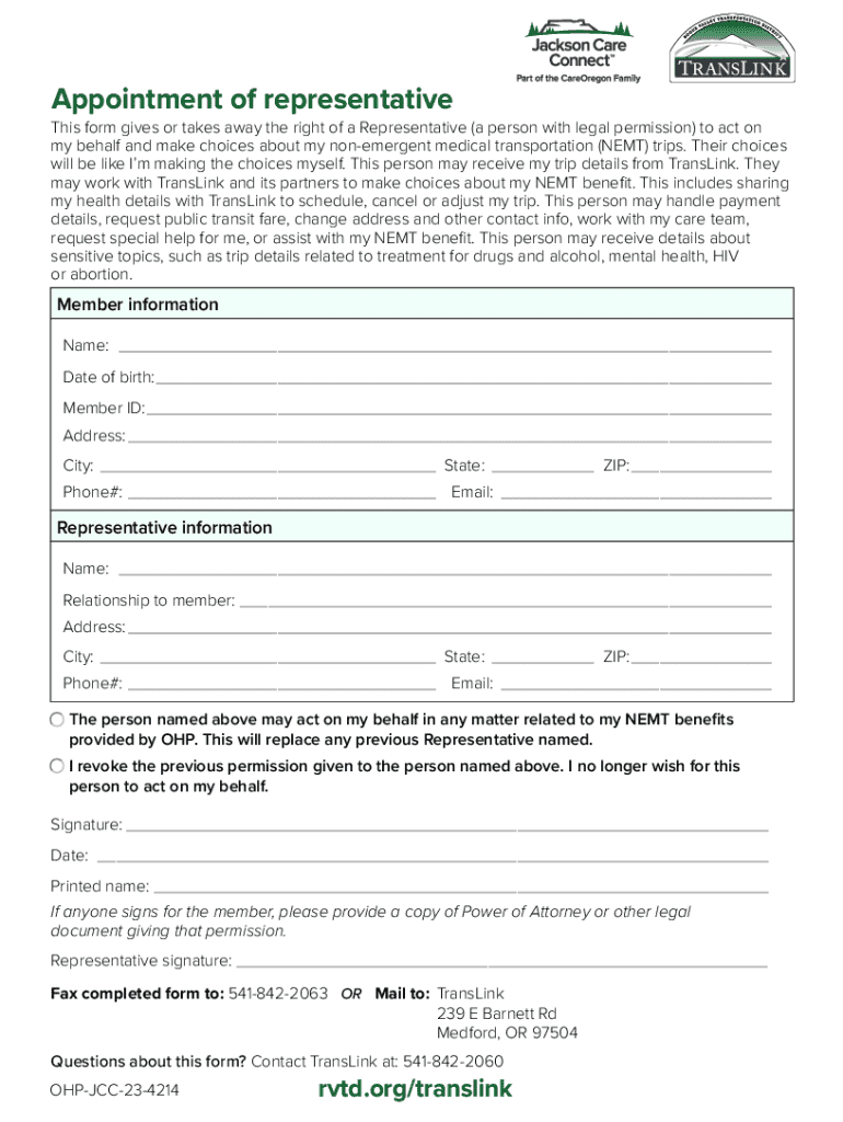 Appointment of representatives form gives or takes away the right of a Representative (a person with legal permission) to act on my behalf and make choices about my nonemergent medical transportation