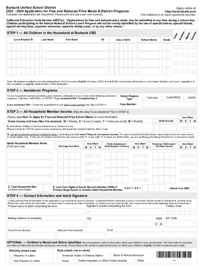 Burbank Unified School District 2023 2024 Application for Free and Reduced Price Meals & District ProgramsApply online at http://schoolcafe.comComplete one application per household. Please print