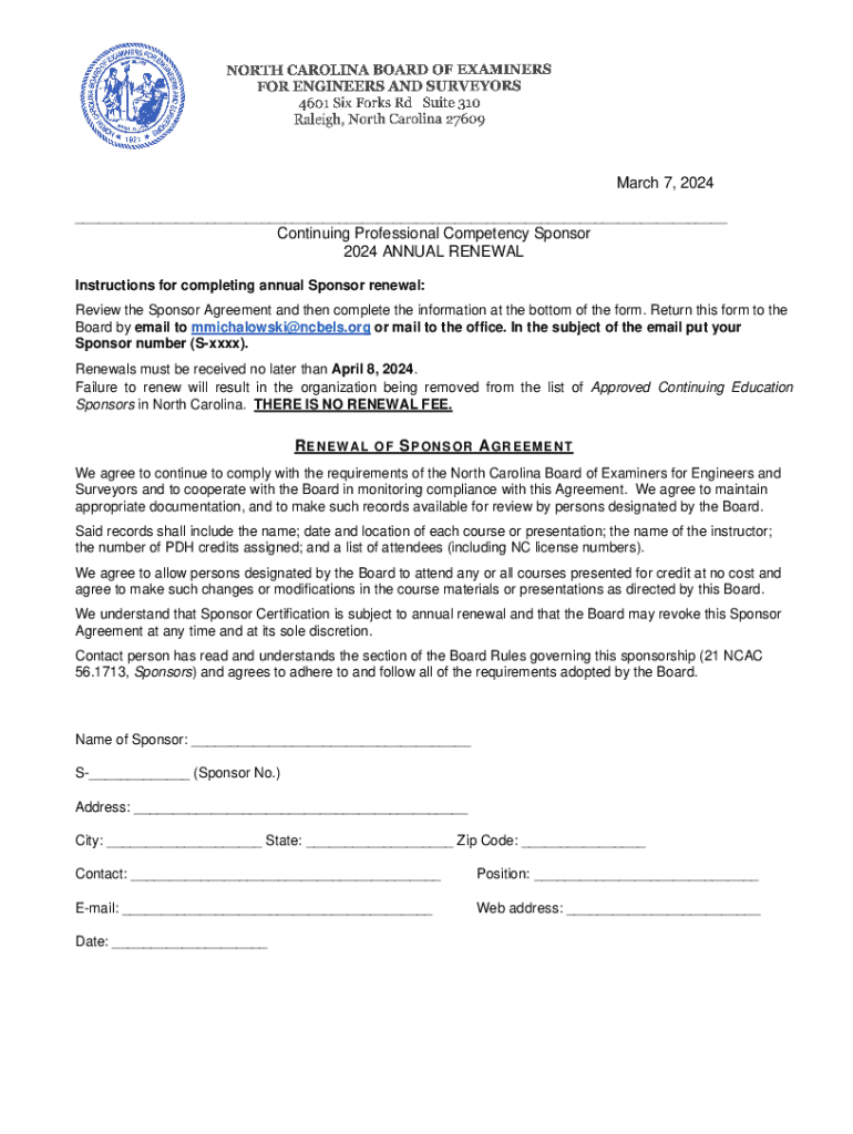 March 7, 2024 ___Continuing Professional Competency Sponsor 2024 ANNUAL RENEWAL Instructions for completing annual Sponsor renewal: Review the Sponsor Agreement and then complete the information at