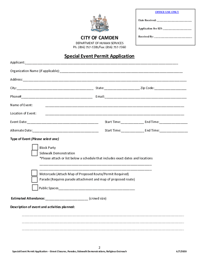 City of Camden Public Spaces & Closure of Streets Block party, Parade & Demonstration Permit Special Event Application Department of Human Services Bureau of Recreation 1000 North 6th Street Camden,