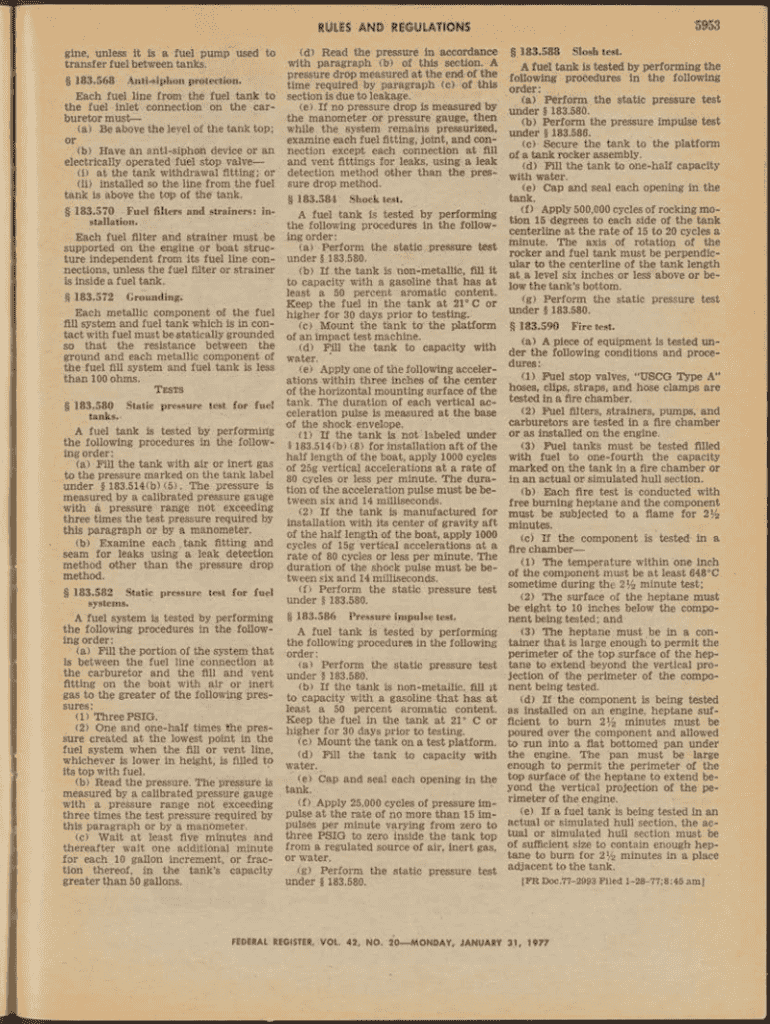 \'5953RULES A N D REGULATIONSgine, unless it is a fuel pump used to transfer fuel between tanks. 183.568Antisiphon protection. Each fuel line from the fuel tank to the fuel inlet connection on the