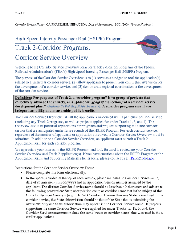 Track 2OMB No. 21300583Corridor Service Name: CAPHASE2HSRNEPA/CEA Date of Submission: 10/01/2009 Version Number: 1HighSpeed Intercity Passenger Rail (HS IPR) ProgramTrack 2Corridor Programs: Corridor