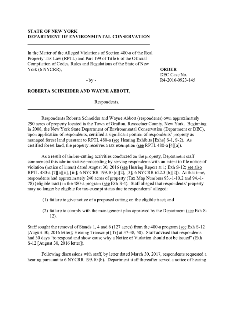 STATE OF NEW YORK DEPARTMENT OF ENVIRONMENTAL CONSERVATION ___ In the Matter of the Alleged Violations of Section 480a of the Real Property Tax Law (RPTL) and Part 199 of Title 6 of the Official Compilation