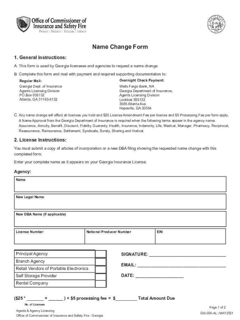 Name Change Form 1. General Instructions: A. This form is used by Georgia licensees and agencies to request a name change. B. Complete this form and mail with payment and required supporting documentation