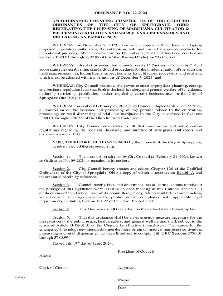 ORDINANCE NO. 222024 AN ORDINANCE CREATING CHAPTER 126 OF THE CODIFIED ORDINANCES OF THE CITY OF SPRINGDALE, OHIO REGULATING THE LICENSING OF MARIJUANA CULTIVATOR & PROCESSING FACILITIES AND MARIJUANA