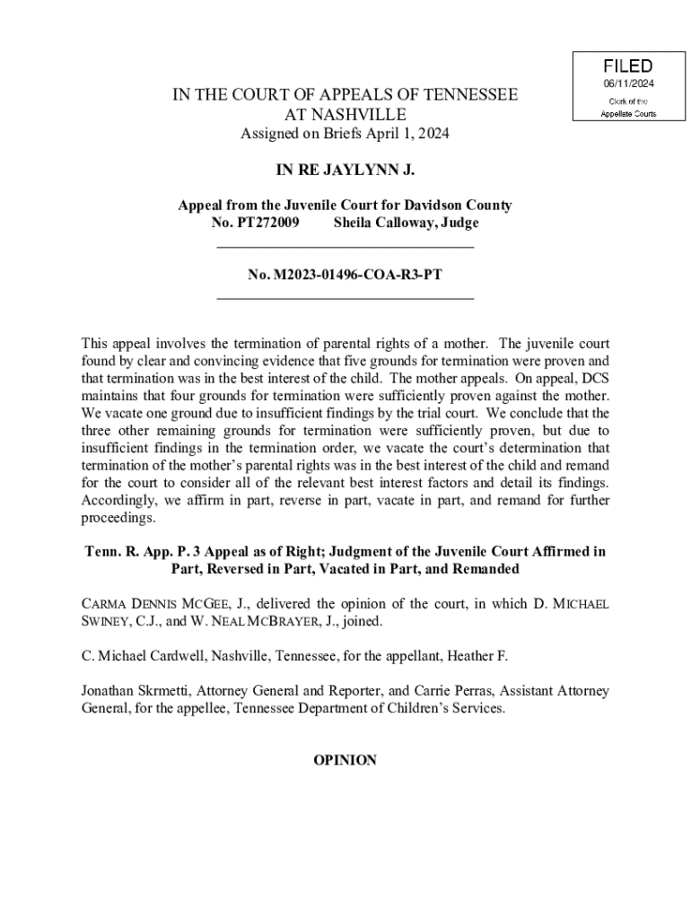 IN THE COURT OF APPEALS OF TENNESSEE AT NASHVILLE06/11/2024Assigned on Briefs April 1, 2024, IN RE JACLYN J. Appeal from the Juvenile Court for Davidson County No. PT272009 Sheila Calloway, Judge