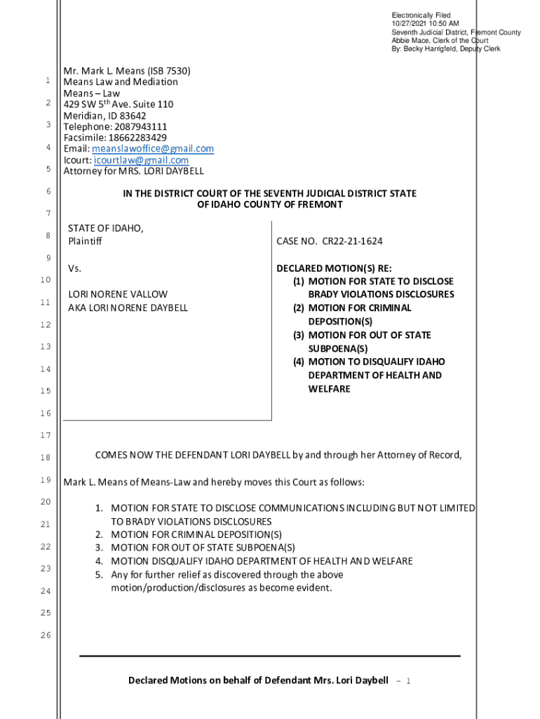 Electronically Filed 10/27/2021 10:50 AM Seventh Judicial District, Fremont County Abbie Mace, Clerk of the Court By: Becky Harried, Deputy Clerk1 2 3 4 5Mr. Mark L. Means (ISB 7530) Means Law and