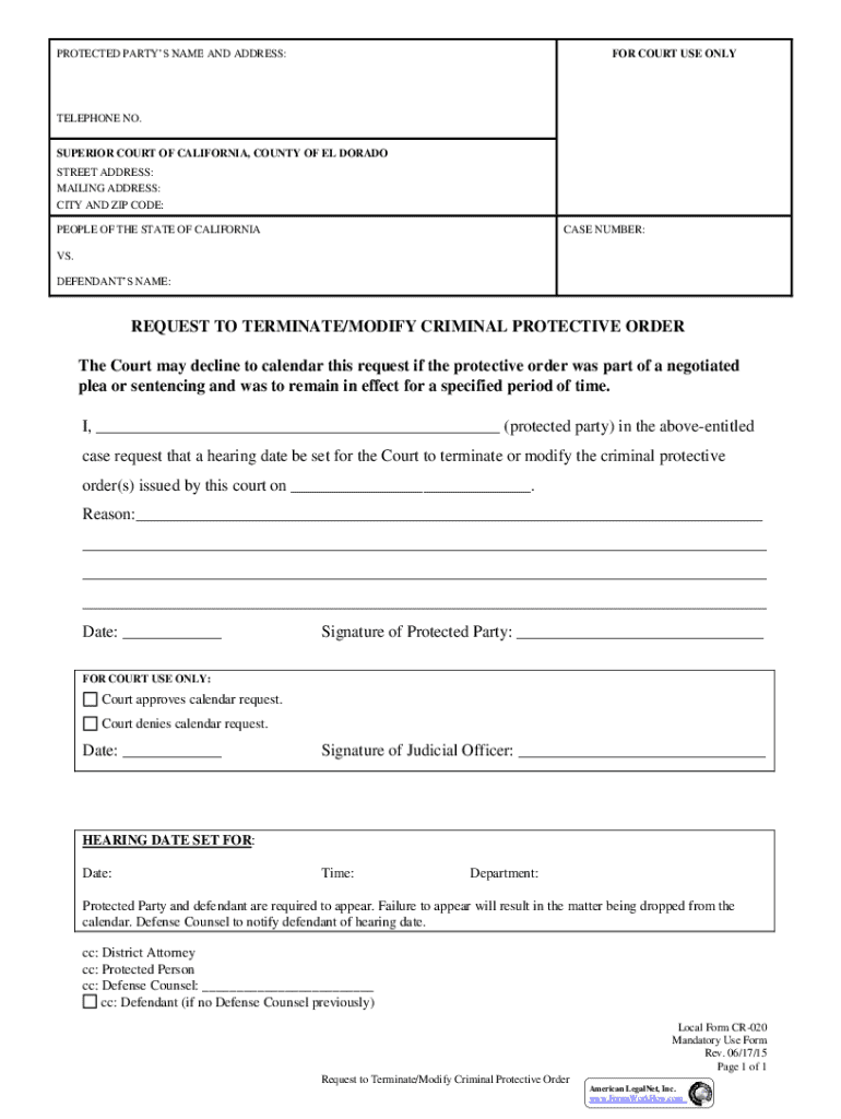 PROTECTED PARTY NAME AND ADDRESS:FOR COURT USE ONLYTELEPHONE NO. SUPERIOR COURT OF CALIFORNIA, COUNTY OF EL DORADO STREET ADDRESS: MAILING ADDRESS: CITY AND ZIP CODE: PEOPLE OF THE STATE OF CALIFORNIANS