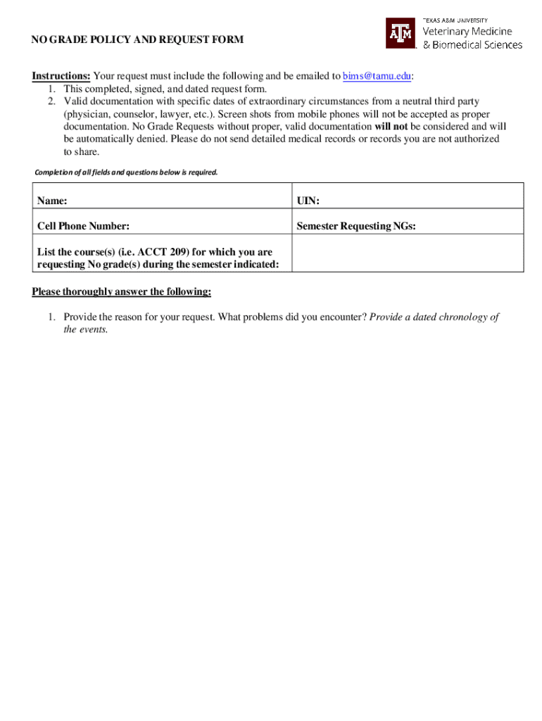 NO GRADE POLICY AND REQUEST FORM Instructions: Your request must include the following and be emailed to bims@tamu.edu: 1. This completed, signed, and dated request form. 2. Valid documentation with