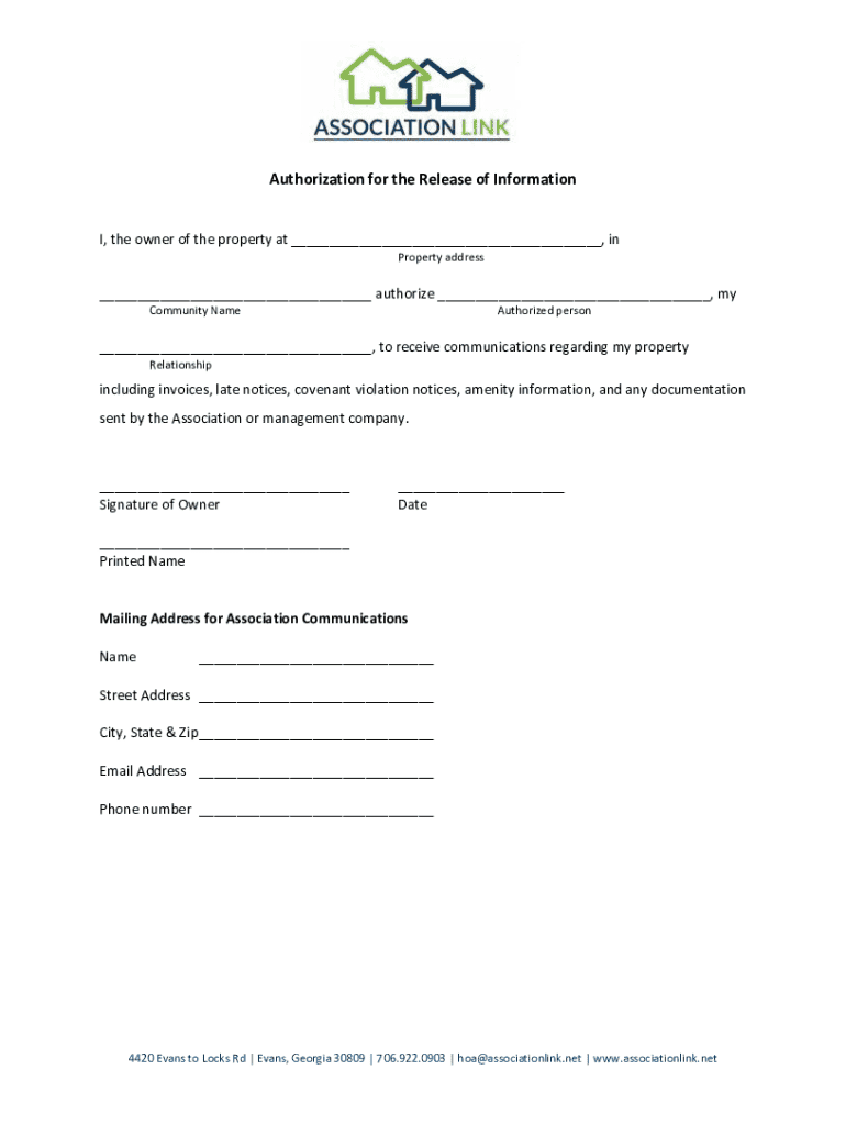 Authorization for the Release of InformationI, the owner of the property at ___, in Property address___ authorize ___, my Community NameAuthorized person___, to receive communications regarding my