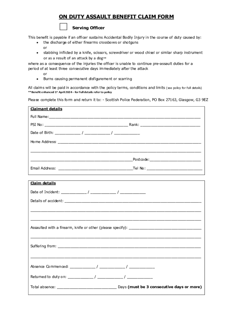 ON DUTY ASSAULT BENEFIT CLAIM FORM Serving Officer This benefit is payable if an officer sustains Accidental Bodily Injury in the course of duty caused by: the discharge of either firearms crossbows