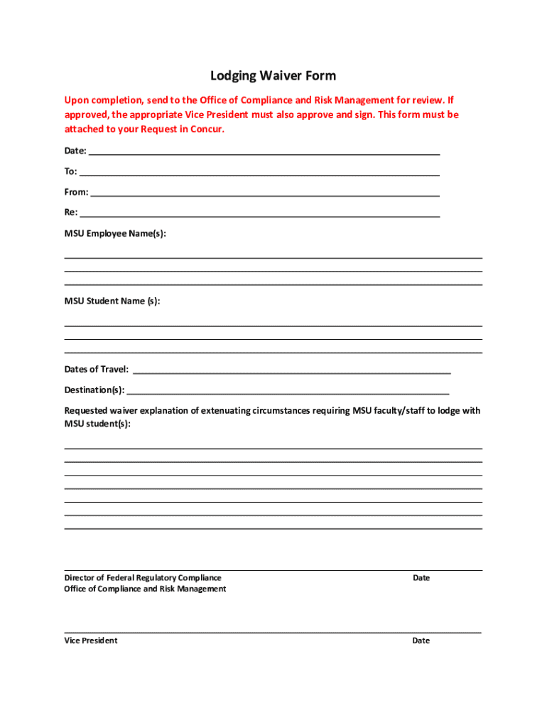 Lodging Waiver Form Upon completion, send to the Office of Compliance and Risk Management for review. If approved, the appropriate Vice President must also approve and sign. This form must be attached
