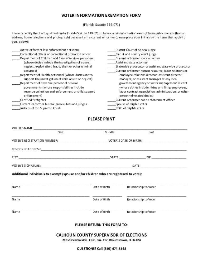 VOTER INFORMATION EXEMPTION FORM (Florida Statute 119.071) I hereby certify that I am qualified under Florida Statute 119.071 to have certain information exempt from public records (home address,