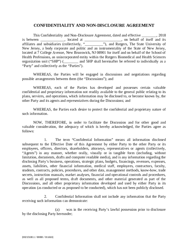 What is NDA Template for SHRP (00215100).DOCX. 00215100.1 / 00000 / 011610/font8 - shp rutgers Form?