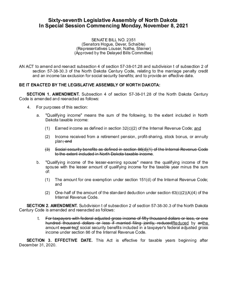 Sixty seventh Legislative Assembly of North Dakota In Special Session Commencing Monday, November 8, 2021, SENATE BILL NO. 2351 (Senators Hague, Never, Schiebel) (Representatives Loser, Neither, Steiner)