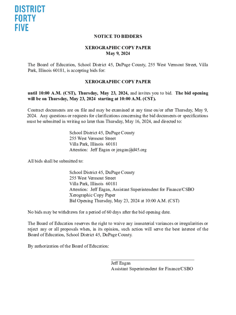 NOTICE TO BIDDERS XEROGRAPHIC COPY PAPER May 9, 2024 he Board of Education, School District 45, DuPage County, 255 West Vermont Street, Villa T Park, Illinois 60181, is accepting bids for: XEROGRAPHIC