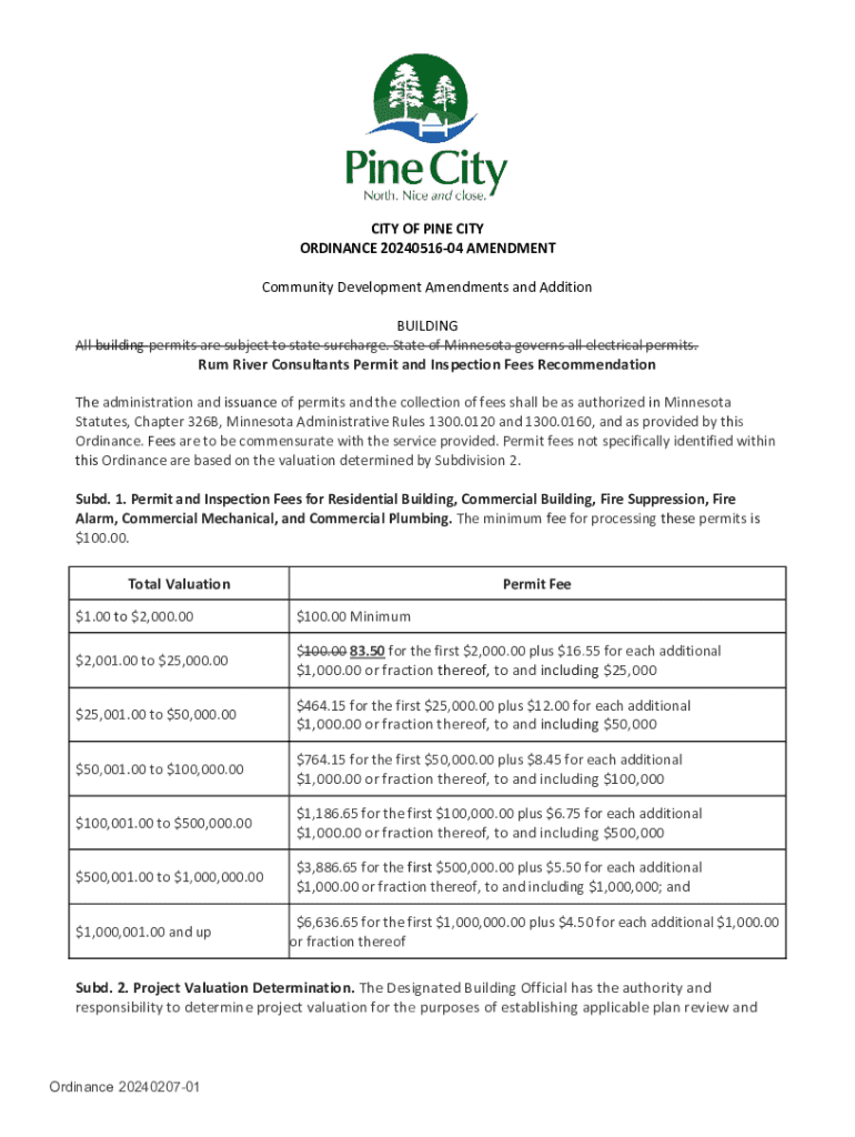 CITY OF PINE CITY ORDINANCE 2024051604 AMENDMENT Community Development Amendments and Addition BUILDING All building permits are subject to state surcharge. State of Minnesota governs all electrical