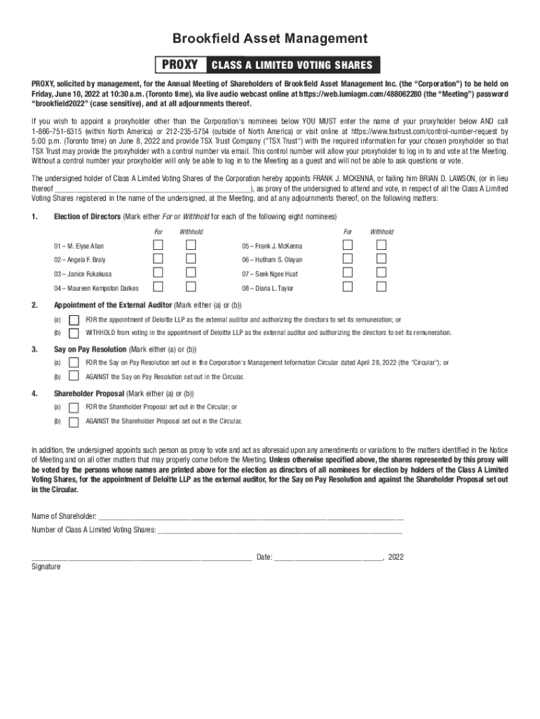 Brookfield Asset Management PRE-CLASS A LIMITED VOTING SHARESPROXY, solicited by management, for the Annual Meeting of Shareholders of Brookfield Asset Management Inc. (the Corporation) to be held
