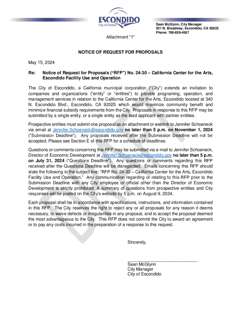 Sean McGlynn, City Manager 201 N. Broadway, Escondido, CA 92025 Phone: 7608394587Attachment 1 NOTICE OF REQUEST FOR PROPOSALS May 15, 2024, Re:Notice of Request for Proposals (RFP) No. 2430 California
