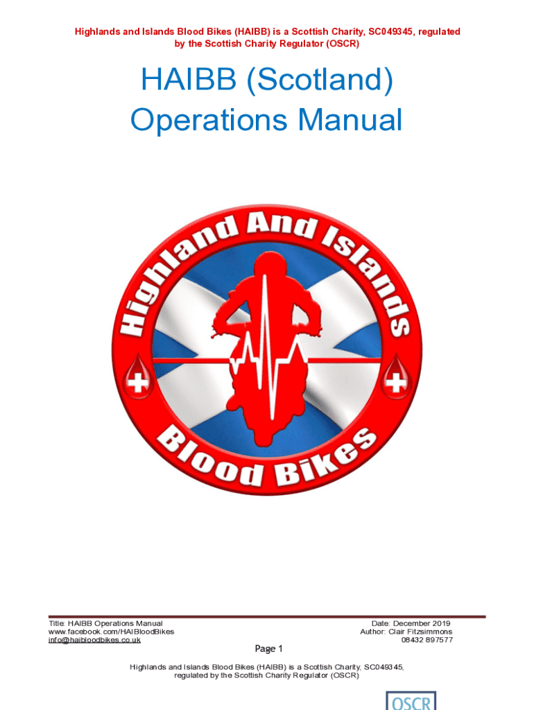 Highlands and Islands Blood Bikes (HA IBB) is a Scottish Charity, SC049345, regulated by the Scottish Charity Regulator (OSCAR)HA IBB (Scotland) Operations ManualTitle: HA IBB Operations Manual www.facebook.com/HAIBloodBikes