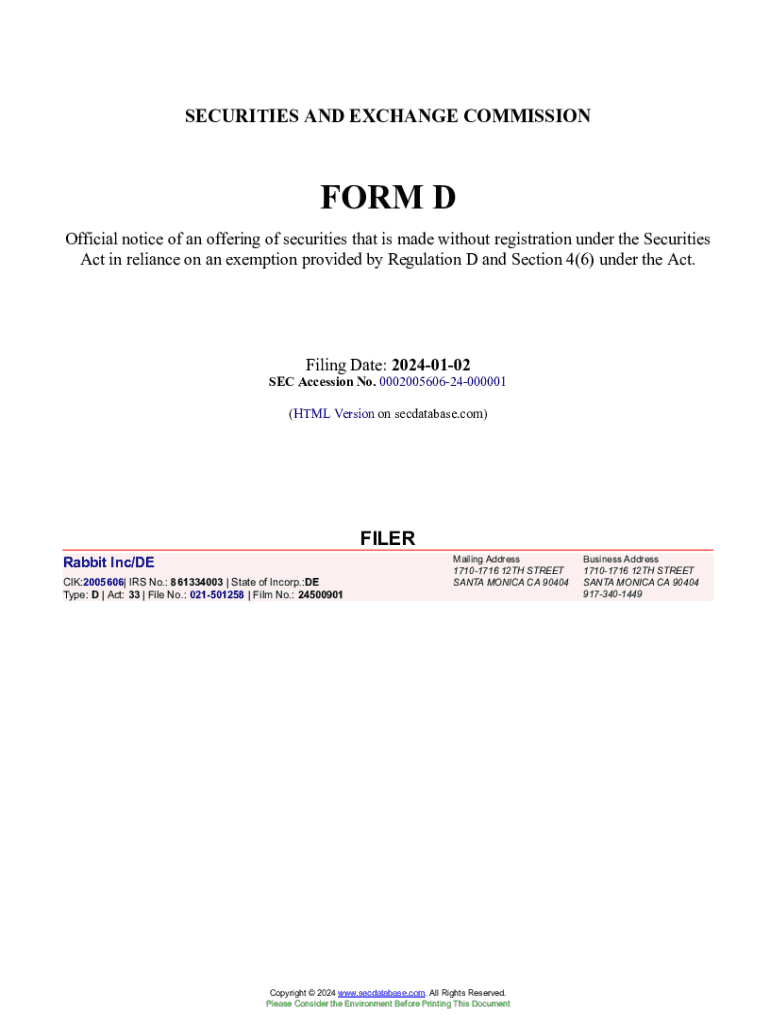 Get the free Rabbit Inc/DE Form D Filed 2024-01-02. Accession Number