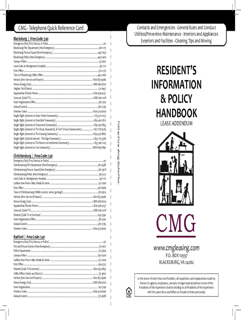 CMG Telephone Quick Reference Recontacts and Emergencies General Rules and Conduct Utilities/Preventive Maintenance Interiors and Appliances Exteriors and Facilities Cleaning Tips and Moving Blacksburg