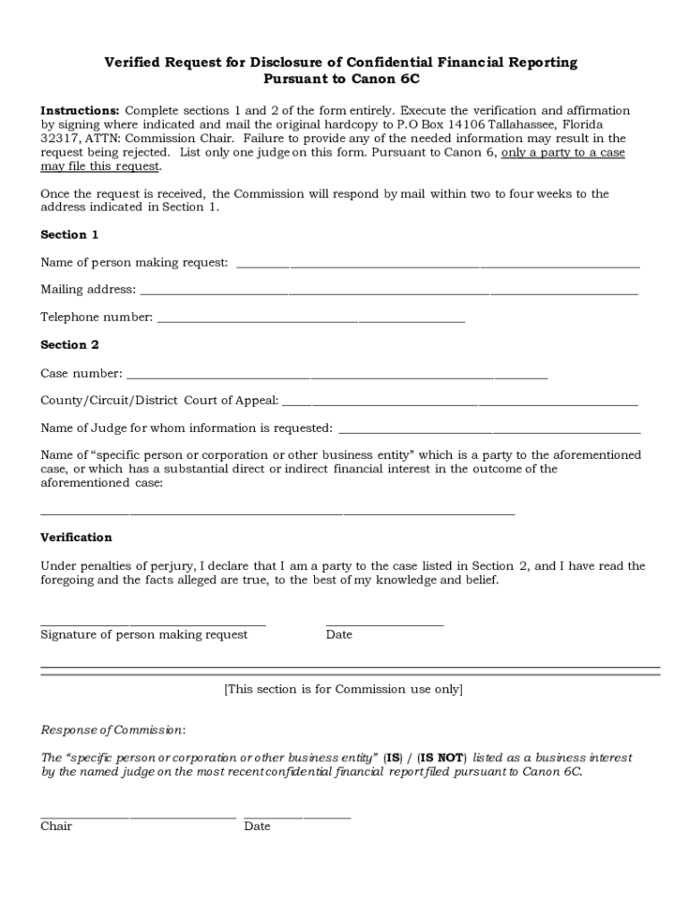 Verified Request for Disclosure of Confidential Financial Reporting Pursuant to Canon 6C Instructions: Complete sections 1 and 2 of the form entirely. Execute the verification and affirmation by signing