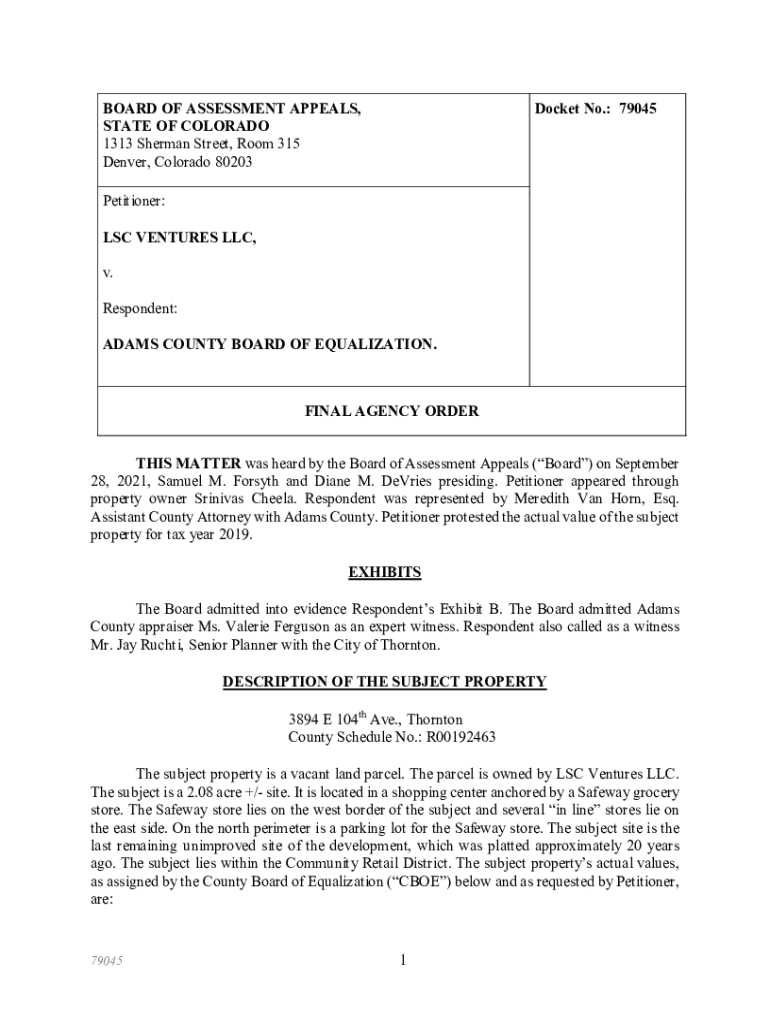 BOARD OF ASSESSMENT APPEALS, STATE OF COLORADO 1313 Sherman Street, Room 315 Denver, Colorado 80203Docket No.: 79045Petitioner: LSC VENTURES LLC, v. Respondent: ADAMS COUNTY BOARD OF EQUALIZATION.FINAL