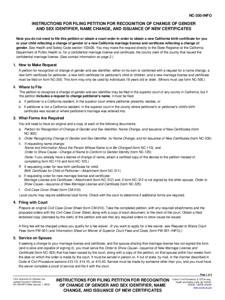 NC300INFOINSTRUCTIONS FOR FILING PETITION FOR RECOGNITION OF CHANGE OF GENDER AND SEX IDENTIFIER, NAME CHANGE, AND ISSUANCE OF NEW CERTIFICATES Note you do not need to file this petition or obtain